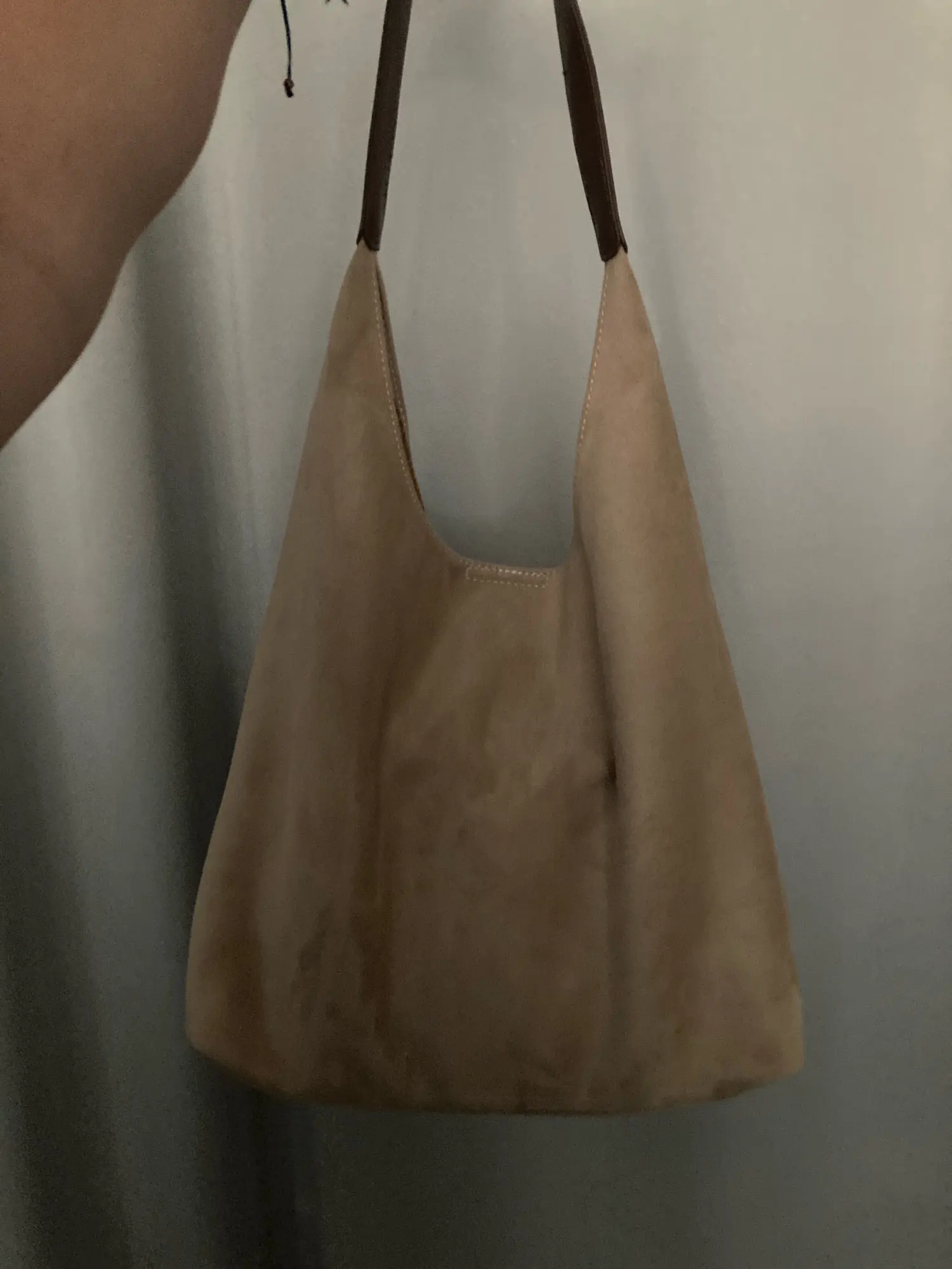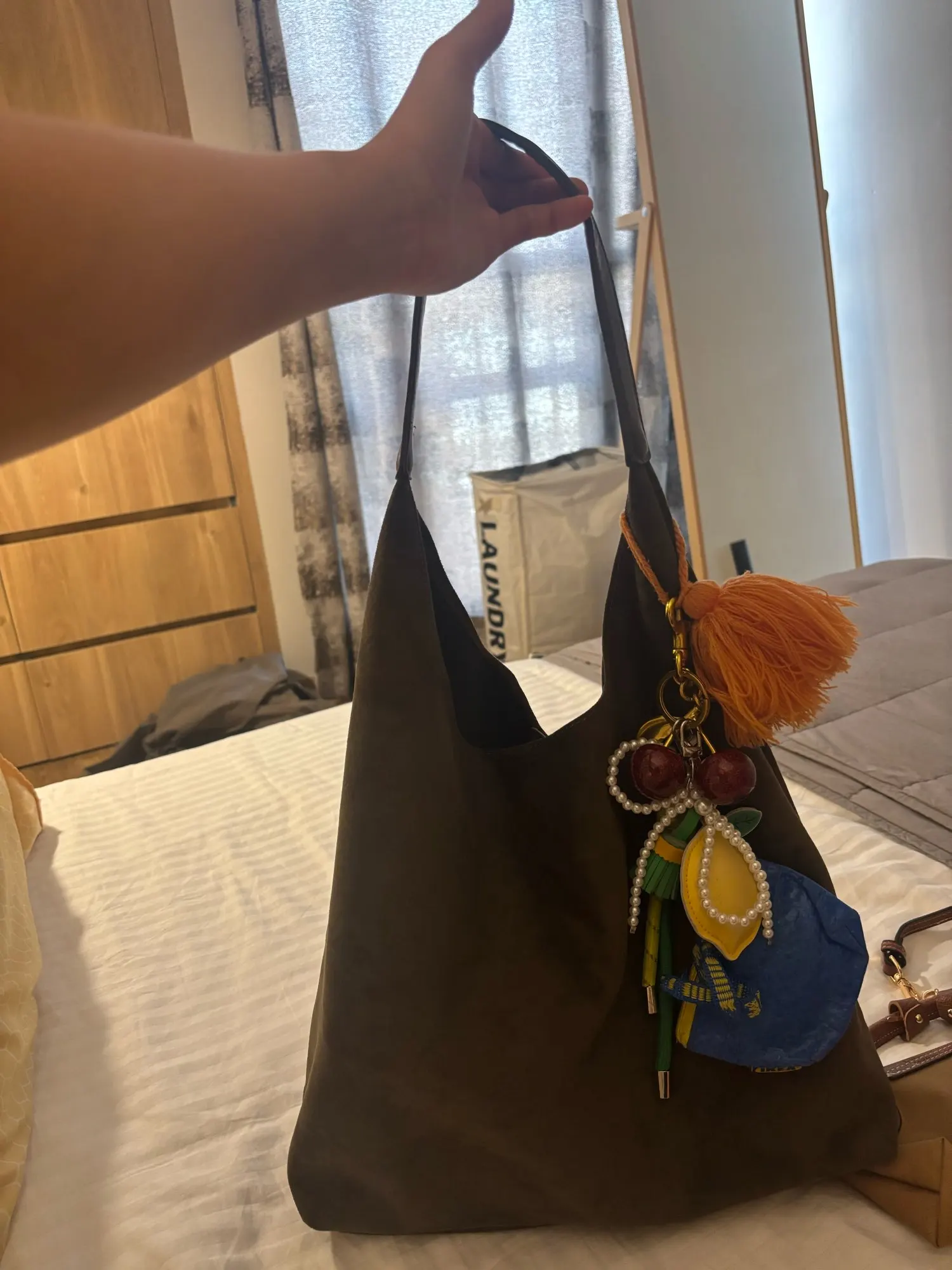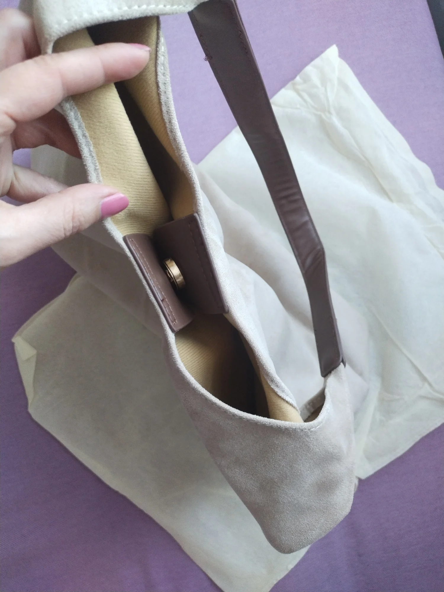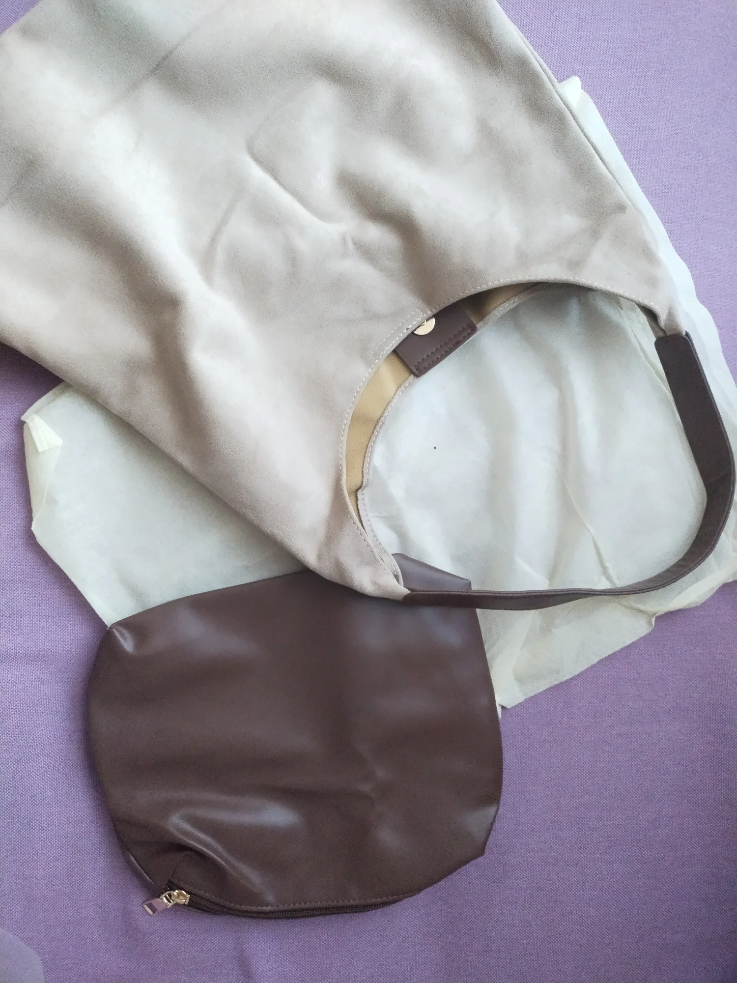 Bon sac, agréable au toucher, ressemble à de la daim, la poignée est confuse car elle semble être en cuir synthétique, mais c'était clair sur la photo. Il est livré avec un dust bag, et à l'intérieur se trouve une trousse à maquillage et un porte-monnaie attaché à la fermeture. En général, j'aime ça.